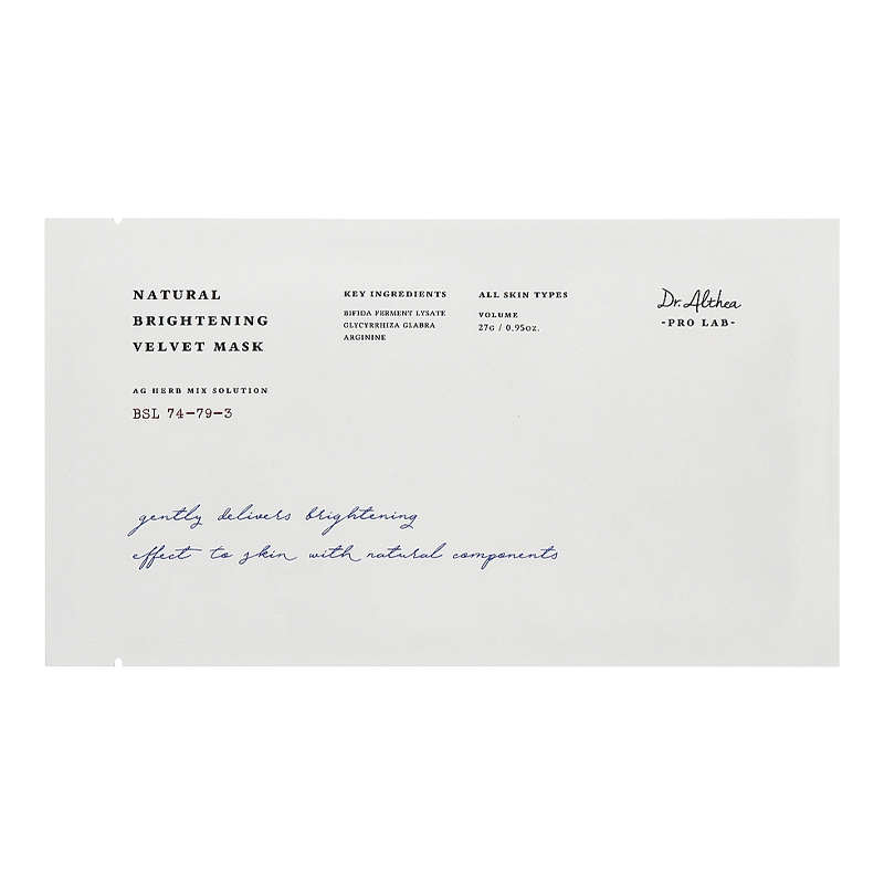 Natural Brightening Velvet Mask Fabric face mask soaked in cosmetic essence TM Dr.Althea Pro Lab The essence with which the mask is impregnated contains a formula of 12 types of plant extracts, shea and olive butter, a complex of probiotics, panthenol and milk proteins. Active components intensively moisturize, nourish and soothe the skin, restore its elasticity and firmness. Extracts of licorice, rice and Chinese lemongrass brighten and even out skin tone, help lighten age spots and improve the appearance of the skin. The nano-microfiber base of the mask has a soft, velvety texture and adheres tightly to the skin, facilitating faster and more effective penetration of active ingredients.