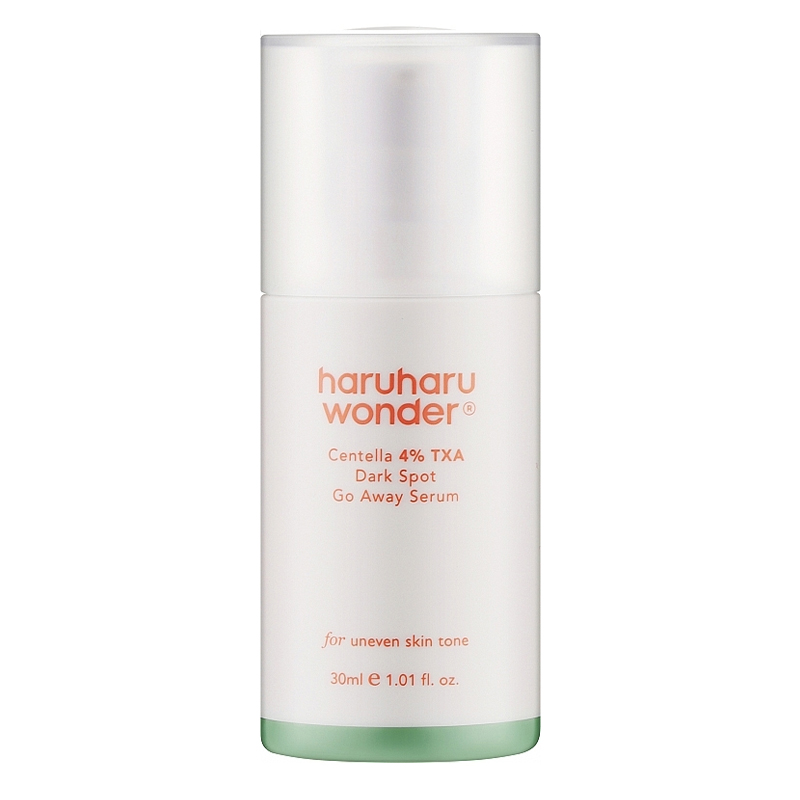 Haruharu Wonder - Centella 4% TXA Dark Spot Go Away Serum - сироватка для шкіри з нерівним тоном. Дія продукту базується на вітаміні С у формі SAP, транексамовій кислоті 4% і ніацинаміді 4%, які разом впливають на кількість меланіну в клітинах і вирівнюють тон шкіри. Вони також розгладжують шкіру, зменшують наявні пігментні плями і запобігають утворенню нових. Композицію доповнює центелла азіатська і її похідні, які мають заспокійливу і зволожуючу дію. Завдяки гелевій текстурі сироватка швидко вбирається, не залишаючи відчуття липкості.