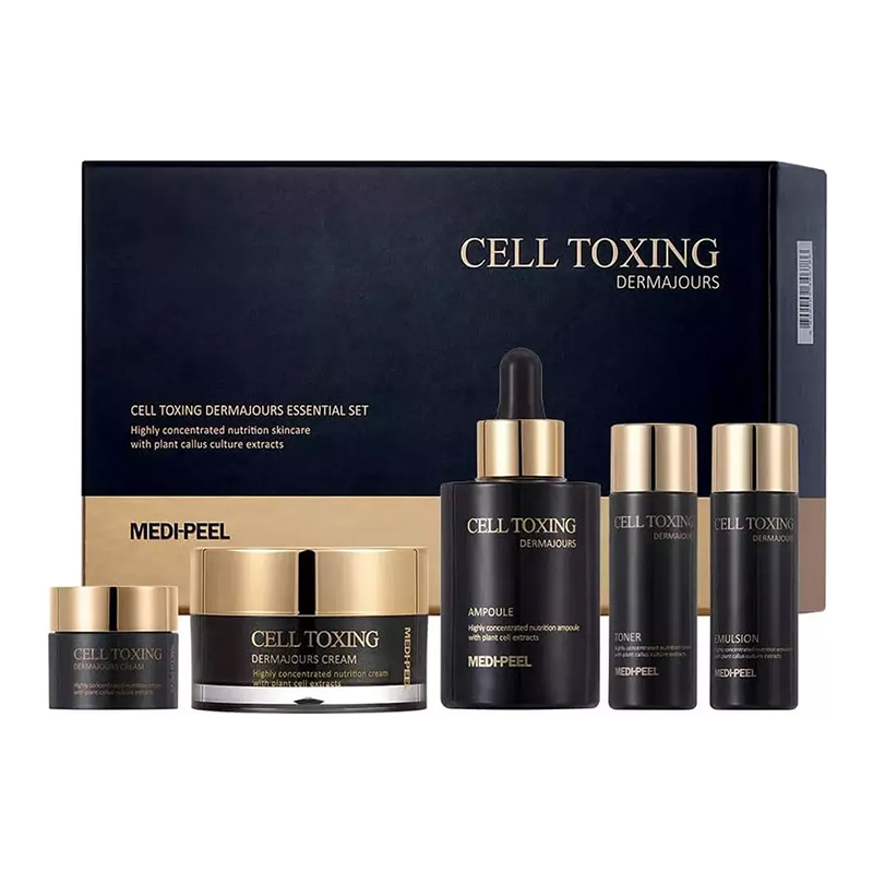 Medi-peel Cell Toxing Dermajours Emulsion: Aqua, Dipropylene Glycol, Triethylhexanoin, Glycerin, 1,2-Hexanediol, Niacinamide, Caprylic/Capric Triglyceride, Propanediol, Trimethylolpropane Tricaprylate/Tricaprate, Hydrogenated Polydecene, Butylene Glycol, Glycereth-26, Sorbitan Stearate, Cetearyl Alcohol, Glyceryl Stearate SE, Glyceryl Stearate, Leontopodium Alpinum Callus Culture Extract, Magnolia Officinalis Bark Extract, Ficus Carica (Fig) Fruit Extract, Morus Alba Fruit Extract, Punica Granatum Fruit Extract, Ginkgo Biloba Nut Extract, Triticum Vulgare (Wheat) Sprout Extract, Brassica Oleracea Italica (Broc Coli) Extract, Brassica Oleracea Capitata (Cabbage) Leaf Extract, Medicago Sativa (Al Falfa) Extract, Raphanus Sativus (Radish) Seed Extract, Brassica Campestris (Rapesee D) Extract, Malt Extract, Sodium Hyaluronate, Adenosine, Panthenol, Beta-Glucan, Dimethicone, Lecithin, Polysorbate 20, Polysorbate 60, PEG-100 Stearate, Arginine, Carbomer, Xanthan Gum, Disodium EDTA, Ethylhexylglycerin, Dipeptide Diaminobutyroyl Benzylamide Diacetate, Palmitoyl Tripeptide-5, Copper Tripeptide-1, Tripeptide-1, Palmitoyl Pentapeptide-4, Nonapeptide-1, Acetyl Octapeptide-3, Acetyl Hexapeptide-8, Hexapeptide-9, Palmitoyl Tetrapeptide-7, Palmitoyl Tripeptide-1, Parfum, Linalool, Hydroxycitronellal, Limonene